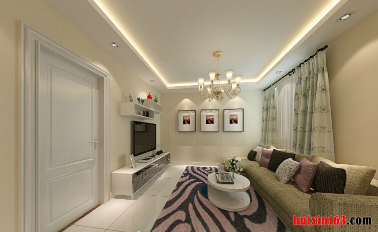 在客厅的顶面上设计了明亮的灯带,搭配简约的石膏吊顶结构,给人非常优雅和富有条理的感觉。在客厅悬挂着一盏造型简洁清新的水晶吊灯,搭配绿色花纹的窗帘,给人非常清爽的感受。在电视背景墙上设计的两个嵌套的格子,可以摆放一些小的挂件,非常的实用,同时具备一定的装饰功能。