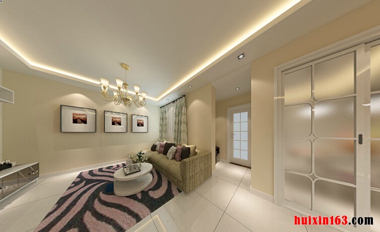 在客厅的顶面上设计了明亮的灯带,搭配简约的石膏吊顶结构,给人非常优雅和富有条理的感觉。在客厅悬挂着一盏造型简洁清新的水晶吊灯,搭配绿色花纹的窗帘,给人非常清爽的感受。在电视背景墙上设计的两个嵌套的格子,可以摆放一些小的挂件,非常的实用,同时具备一定的装饰功能。