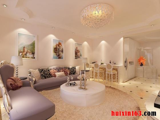 简欧风格很好地糅合了简约主义的利落、爽洁和传统欧陆风格的精致、华丽。这种时尚而富有内涵的风格正逐渐受到一些年轻新贵的追崇,客厅的整体砖石犹如生活在宫殿般华丽和大气,白色的空间装饰色彩给人的明亮和简洁氛围比较突出,白色的石膏板吊顶装饰加深了空间的延伸气氛,紫色的沙发装饰搭配各色的抱枕瞬间把客厅的温馨浪漫感提升到最高,白色的墙面上几幅欧式的装饰画的悬挂更是把装修风格的特点展现得淋漓尽致,圆形的大型水晶灯的使用把奢华和大气感展现得淋漓尽致,电视背景墙的设计比较富有层次感,花纹壁纸的铺设加上实木的框架的打造让电视背景墙的立体感更加突出。